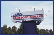 Dreiseitig beschriftetes und beleuchtetes Schild (Baustoff-Müller, Stadtallendorf)